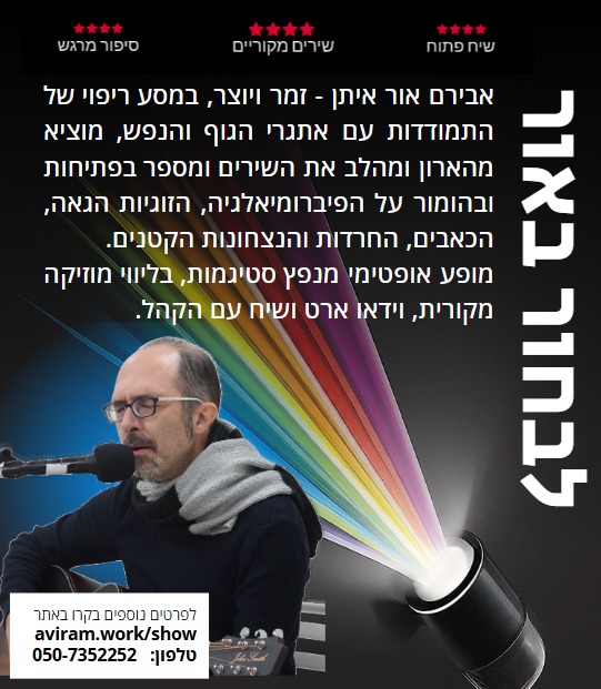 אבירם אור איתן זמר ויוצר, במסע ריפוי של התמודדות עם אתגרי הגוף והנפש, מוציא מהארון ומהלב את השירים ומספר בפתיחות ובהומור על הפיברומיאלגיה, הזוגיות הגאה, הכאבים, החרדות והנצחונות הקטנים.
